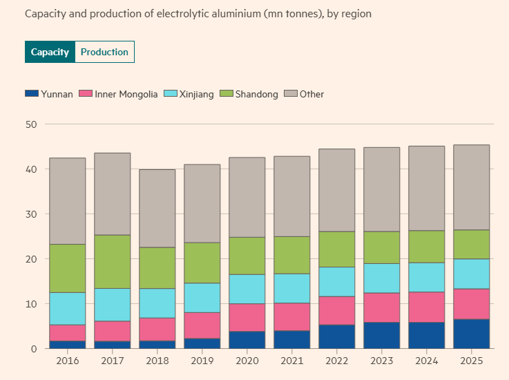 文章援引中国行业数据称,中国2024年电解铝的产量达到4380万吨,约占全球总产量的60%。文章表示,然而,近年来由于中国大规模的产能转移,如今有1300万吨的电解铝产能来自云南、四川、新疆和内蒙古等地的冶炼厂,约占全国总产能的30%。这些地区新建的铝冶炼厂采用清洁能源而且开发成本较低。